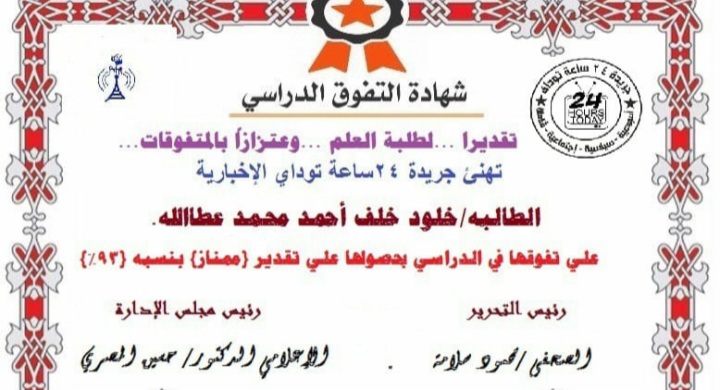 تتقدم اسرة تحرير جريدةوموقع24 ساعةتوداي علي رأسها الدكتور حسين المصري رئيس مجلس ادارة والصحفي الأستاذ محمود سلامة رئيس تحرير الجريدة بخالص التهنئة والتبريكات للطالبه خلود خلف احمد ابنة أخت الإعلامي النجم ياسر ابوشقرة لتميزها وتفوقها في الشهادة الإعدادية بنسبه 93٪ .