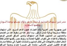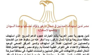 - مصر تدين استهداف المدنيين في شمال دارفور وتؤكد تمسكها بوحدة السودان ودعمها لاستقراره