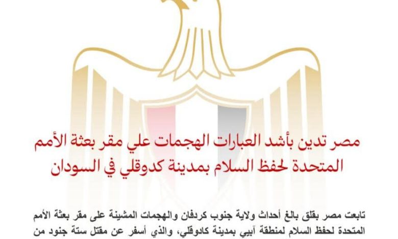 أدانت جمهورية مصر العربية، بأشد العبارات، الهجمات التي استهدفت مقر بعثة الأمم المتحدة لحفظ السلام بمدينة كادوقلي بولاية جنوب كردفان في السودان، والتي أسفرت عن مقتل ستة من بنجلاديش وإصابة ثمانية آخرين.