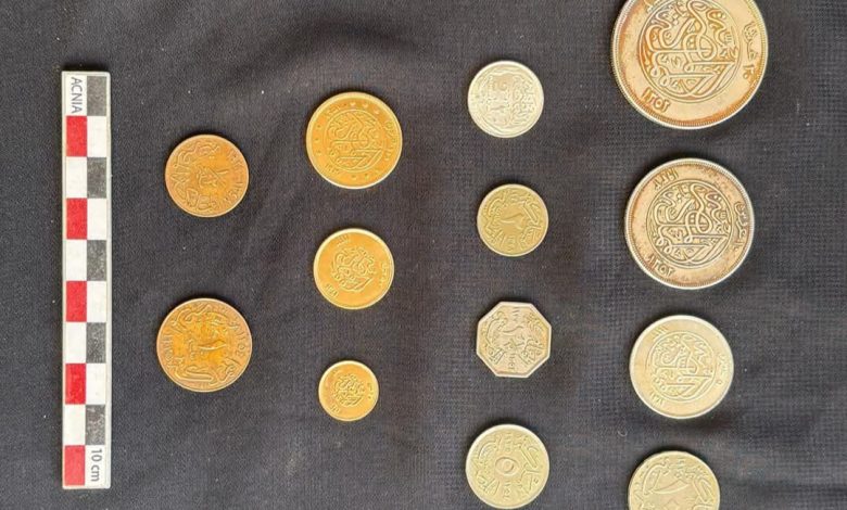 كما عثر بداخلها على ثلاث عشرة قطعة نقدية من فئات مختلفة، تراوحت ما بين المليمات والعملات الذهبية من فئة 100 قرش.
