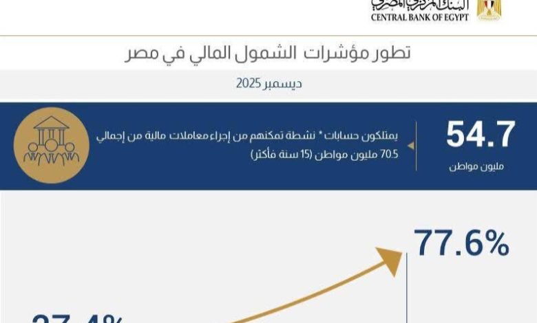 أسفرت جهود البنك المركزي المصري والقطاع المالي، عن مواصلة معدلات الشمول المالي في مصر ارتفاعها لتصل إلى 77.6% بنهاية 2025، ليصبح عدد المواطنين الذين يمتلكون حسابات نشطة تمكنهم من إجراء معاملات مالية 54.7 مليون مواطن من إجمالي 70.5 مليون مواطن في الفئة العمرية من 15 سنة فأكثر، وبمعدل نمو بلغ219 % خلال الفترة من 2016 إلى 2025.