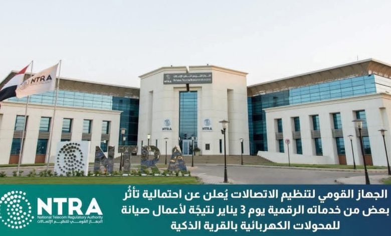 يُعلن الجهاز القومي لتنظيم الاتصالات عن احتمالية تأثُر بعض الخدمات الرقمية التي يقدمها وذلك اليوم السبت الموافق 3 يناير 2026، ابتداءً من الساعة التاسعة صباحًا وحتى الساعة الثالثة عصرًا، نتيجة قيام شركة جنوب القاهرة لتوزيع الكهرباء ببعض أعمال الصيانة الدورية للمحولات الكهربائية بالقرية الذكية، حيث قد يؤدي ذلك إلى تأثُر بعض الخدمات التالية: البوابة الرقمية لخدمات الأجهزة، وتطبيق MyNTRA، وخدمات التحقق من الأرقام على منصة مصر الرقمية ومحافظ شركات المحمول، وخدمات نقل الأرقام، وتطبيق تليفوني الخاص بمنظومة حوكمة الهاتف المحمول، على أن تعود هذه الخدمات للعمل بصورة طبيعية فور انتهاء أعمال الصيانة.