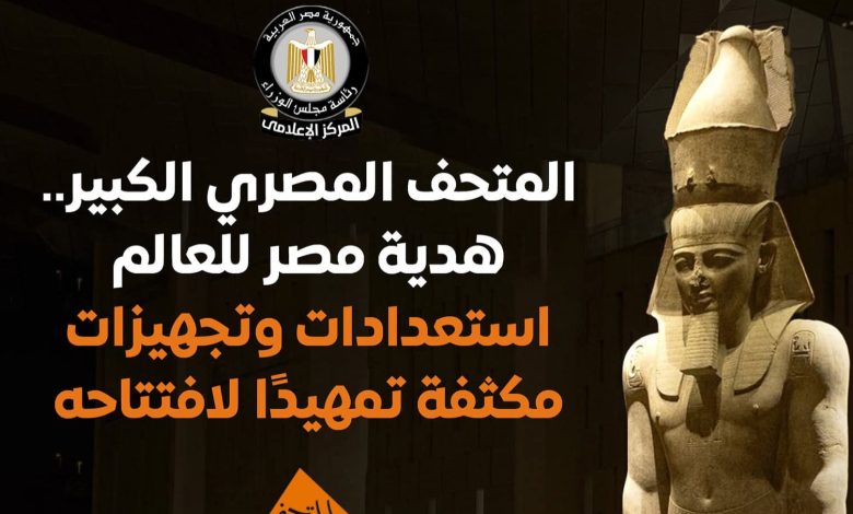 نشر المركز الإعلامي لمجلس الوزراء عددًا من الإنفوجرافات عبر منصاته على مواقع التواصل الاجتماعي، بعنوان “المتحف المصري الكبير.. هدية مصر للعالم.. استعدادات وتجهيزات مكثفة تمهيدًا لافتتاحه”.