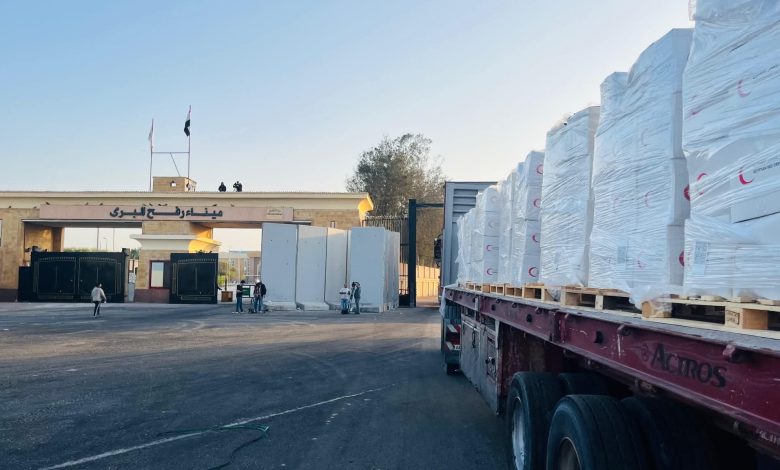 ويتواجد الهلال الأحمر المصري كآلية وطنية لتنسيق وتفويج المساعدات إلى غزة، على الحدود منذ بدء الأزمة حيث لم يتم غلق معبر رفح من الجانب المصري نهائيًا، وواصل تأهبه فى كافة المراكز اللوجستية وجهوده المتواصلة لدخول المساعدات التي بلغت أكثر من نصف مليون طن من المساعدات الإنسانية والإغاثة، وذلك بجهود 35 ألف متطوع بالجمعية.