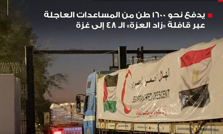 دفع الهلال الأحمر المصري، اليوم، قافلة « زاد العزة .. من مصر إلى غزة» الـ 48، والتي تحمل عدد من شاحنات المساعدات الإنسانية العاجلة في اتجاه قطاع غزة، وذلك في إطار جهوده المتواصلة كآلية وطنية لتنسيق المساعدات إلى غزة.