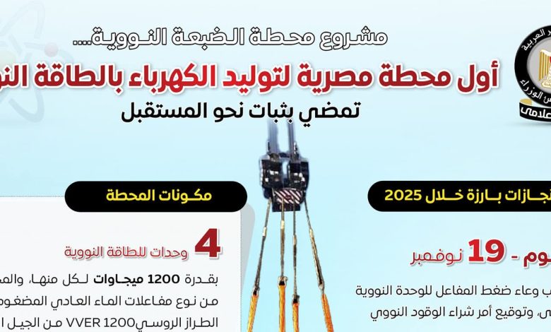 بالإنفوجراف.. المركز الإعلامي لمجلس الوزراء: “محطة الضبعة النووية” أول محطة مصرية لتوليد الكهرباء بالطاقة النووية تمضي بثبات نحو المستقبل