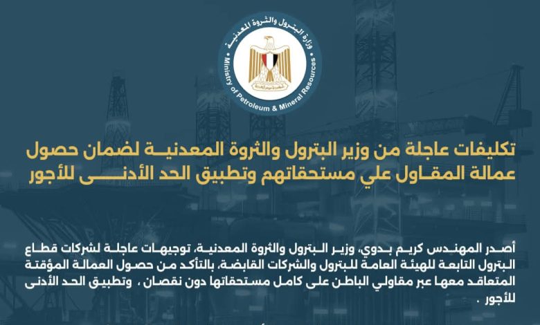 تكليفات عاجلة من وزير البترول والثروة المعدنية لضمان حصول عمالة المقاول على مستحقاتهم وتطبيق الحد الأدنى للأجور