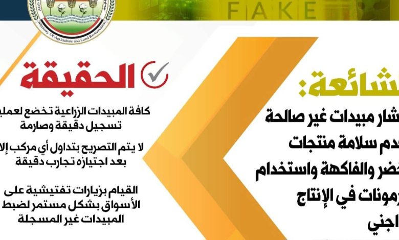 وفي إطار حرص الوزارة على توضيح الحقائق للرأي العام، تؤكد الوزارة أن كافة المبيدات الزراعية المتداولة في الأسواق تخضع لعملية تسجيل دقيقة وصارمة من قبل “لجنة مبيدات الآفات الزراعية”، وهي لجنة تضم نخبة من العلماء والخبراء. ولا يتم التصريح بتداول أي مركب إلا بعد اجتيازه تجارب حقلية وتحليلات معملية دقيقة لضمان مطابقته للمعايير الدولية الصادرة عن منظمة الأغذية والزراعة (FAO) ومنظمة الصحة العالمية (WHO).