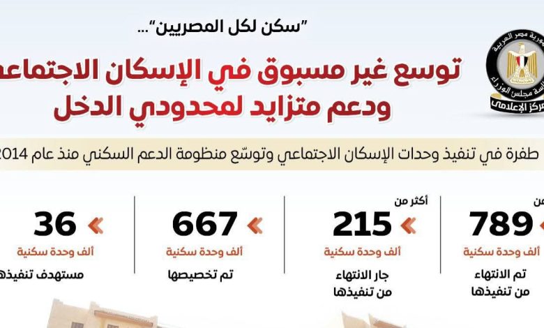 نشر المركز الإعلامي لمجلس الوزراء عددًا من الإنفوجرافات عبر منصاته على مواقع التواصل الاجتماعي، سلط من خلالها الضوء على التوسع غير المسبوق في الإسكان الاجتماعي والدعم المتزايد لمحدودي الدخل، وذلك في إطار المبادرة الرئاسية “سكن لكل المصريين”.