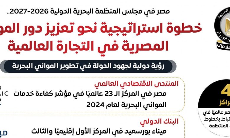 في خطوة نحو تعزيز دور المواني المصرية في التجارة العالمية..المركز الإعلامي لمجلس الوزراء: مصر تفوز بعضوية مجلس المنظمة البحرية الدولية 2026/2027