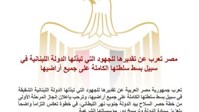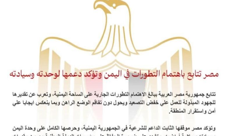 تتابع جمهورية مصر العربية ببالغ الاهتمام التطورات الجارية على الساحة اليمنية، وتعرب عن تقديرها للجهود المبذولة للعمل علي خفض التصعيد ويحول دون تفاقم الوضع الراهن وبما ينعكس ايجابا علي أمن واستقرار المنطقة.