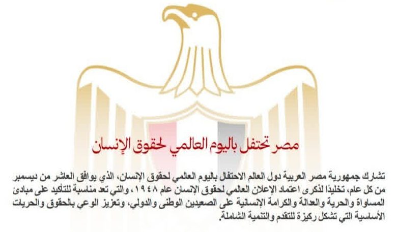 وبهذه المناسبة، تجدد مصر اعتزامها مواصلة تعزيز منظومة حقوق الإنسان على أسس راسخة من احترام الدستور والالتزامات الدولية، وتطوير السياسات والتشريعات الوطنية الداعمة للحقوق والحريات. كما تشدد على التزامها بالعمل المتواصل لضمان حياة كريمة لجميع المواطنين، وإتاحة بيئة آمنة لإعلاء قيم المواطنة وسيادة القانون والمساواة.
