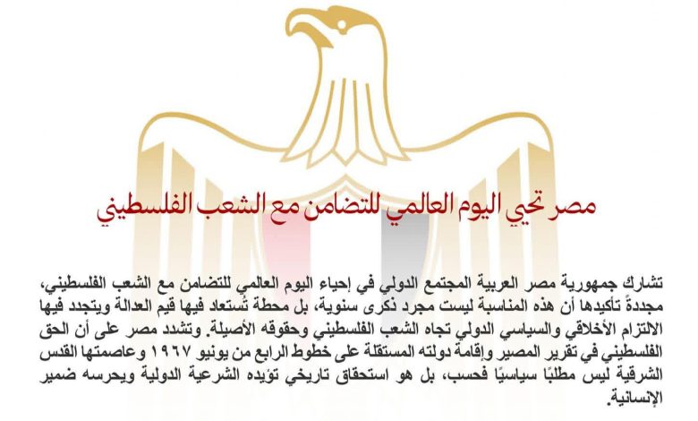 تشارك جمهورية مصر العربية المجتمع الدولي في إحياء اليوم العالمي للتضامن مع الشعب الفلسطيني، مجددةً تأكيدها أن هذه المناسبة ليست مجرد ذكرى سنوية، بل محطة تُستعاد فيها قيم العدالة ويتجدد فيها الالتزام الأخلاقي والسياسي الدولي تجاه الشعب الفلسطيني وحقوقه الأصيلة. وتشدد مصر على أن الحق الفلسطيني في تقرير المصير وإقامة دولته المستقلة على خطوط الرابع من يونيو ١٩٦٧ وعاصمتها القدس الشرقية ليس مطلبًا سياسيًا فحسب، بل هو استحقاق تاريخي تؤيده الشرعية الدولية ويحرسه ضمير الإنسانية.