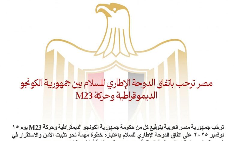 ترحب جمهورية مصر العربية بتوقيع كل من حكومة جمهورية الكونجو الديمقراطية وحركة M23 اليوم على اتفاق الدوحة الإطاري للسلام باعتباره خطوة مهمة نحو تثبيت الأمن والاستقرار في شرق الكونجو وتحقيق المصالحة الوطنية وصون وحدة وسلامة أراضي البلاد.