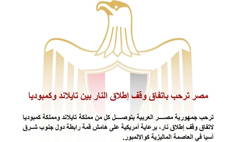 ​ترحب جمهورية مصر العربية بتوصل كل من مملكة تايلاند ومملكة كمبوديا لاتفاق وقف إطلاق نار، برعاية أمريكية على هامش قمة رابطة دول جنوب شرق آسيا في العاصمة الماليزية كوالالمبور.