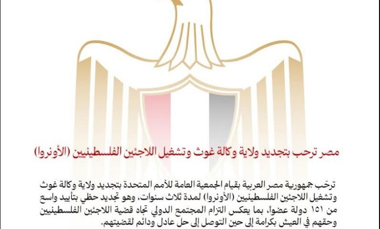 ترحّب جمهورية مصر العربية بقيام الجمعية العامة للأمم المتحدة بتجديد ولاية وكالة غوث وتشغيل اللاجئين الفلسطينيين (الأونروا) لمدة ثلاث سنوات، وهو تجديد حظي بتأييد واسع من ١٥١ دولة عضواً، بما يعكس التزام المجتمع الدولي تجاه قضية اللاجئين الفلسطينيين وحقهم في العيش بكرامة إلى حين التوصل إلى حل عادل ودائم لقضيتهم.