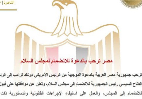 ترحب جمهورية مصر العربية بالدعوة التي وجهها الرئيس الأمريكي دونالد ترامب لرئيس الجمهورية عبد الفتاح السيسي للانضمام إلى مجلس السلام وتعلن موافقتها على قبول الدعوة للانضمام إلى مجلس الإدارة والمضي قدما في الوفاء بالقانونية ذات الصلة والإجراءات الدستورية. كما تجدد مصر تقديرها لقيادة الرئيس الأمريكي دونالد ترامب والتزامه بإنهاء الحرب في غزة وإرساء الأمن والسلام والاستقرار في الشرق الأوسط.