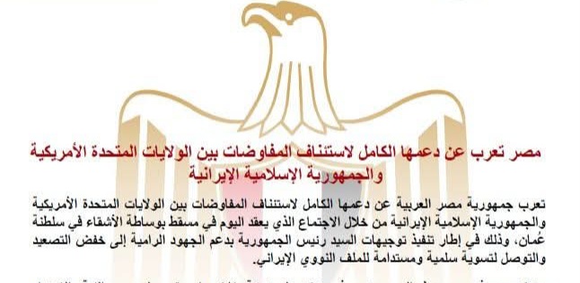 تعرب جمهورية مصر العربية عن دعمها الكامل لاستئناف المفاوضات بين الولايات المتحدة الأمريكية والجمهورية الإسلامية الإيرانية من خلال الاجتماع الذي يعقد اليوم في مسقط بوساطة الأشقاء في سلطنة عُمان، وذلك في إطار تنفيذ توجيهات السيد رئيس الجمهورية بدعم الجهود الرامية إلى خفض التصعيد والتوصل لتسوية سلمية ومستدامة للملف النووي الإيراني.