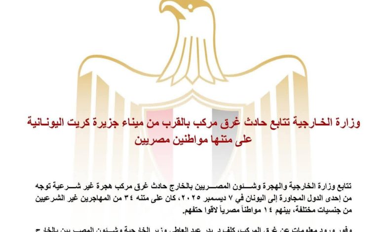 تتابع وزارة الخارجية والهجرة وشئون المصريين بالخارج حادث غرق مركب هجرة غير شرعية توجه من إحدى الدول المجاورة إلى اليونان كان على متنه 34 من المهاجرين غير الشرعيين من جنسيات مختلفة، بينهم 14 مواطنًا مصريًا لقوا حتفهم.