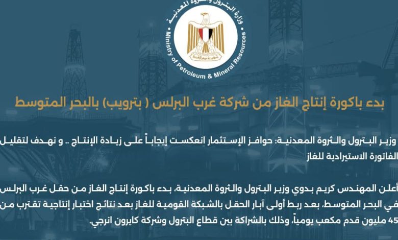 أعلن المهندس كريم بدوي وزير البترول والثروة المعدنية، بدء باكورة إنتاج الغاز من حقل غرب البرلس في البحر المتوسط، بعد ربط أولى آبار الحقل بالشبكة القومية للغاز بعد نتائج اختبار إنتاجية تقترب من 45 مليون قدم مكعب يومياً، وذلك بالشراكة بين قطاع البترول وشركة كايرون انرجي.