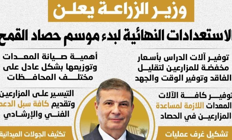 وزير الزراعة يعلن الاستعدادات النهائية لحصاد القمح: 2500 جنيه للإردب وصرف المستحقات خلال 48 ساعة بحد أقصى