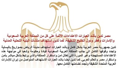 مصر تدين بأشد العبارات الاعتداءات الآثمة على كل من المملكة العربية السعودية والإمارات وقطر ودول الخليج الشقيقة و استهداف منشآت البنية التحتية المدنية